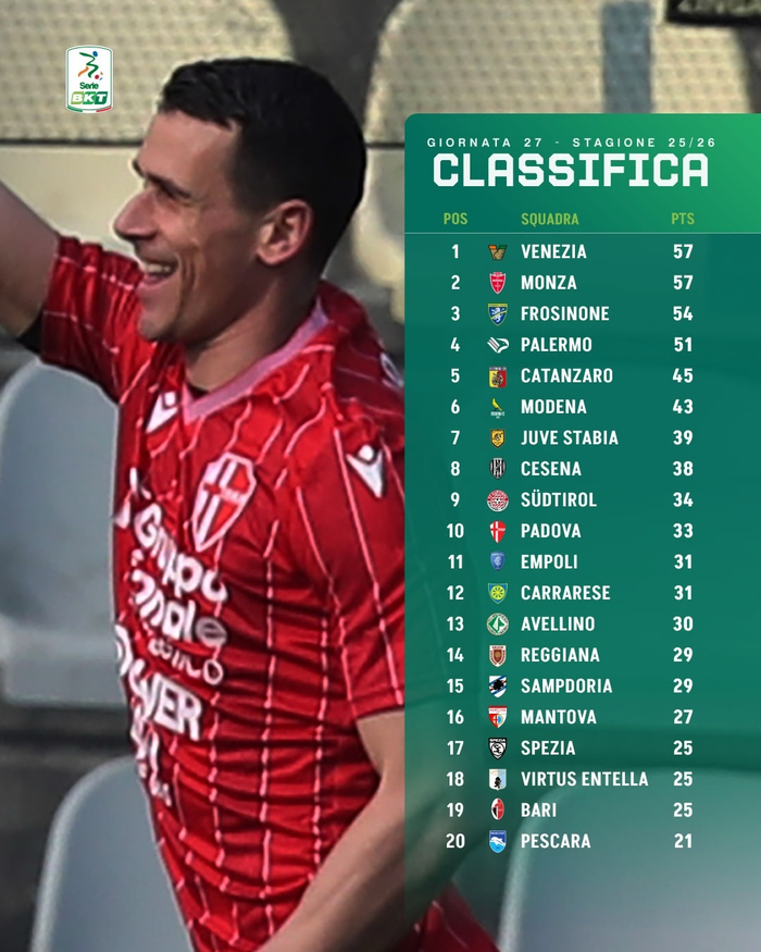 【意乙积分榜】 #意乙# 2025-26赛季意乙联赛第27轮积分榜:👉 由菲利普·因扎吉🇮🇹教练执教的巴勒莫队以14胜9平4负积51分,排名→第4位;👉 由阿巴特🇮🇹教练执教的尤维斯塔比亚队以9胜12平6负积39分,排名→第7位;👉 由斯特罗帕🇮🇹教练执教的威尼斯队以17胜6平4负积57分,排名→第1位;👉 多纳多尼🇮🇹教练刚刚接手的斯佩齐亚队以6胜7平14...